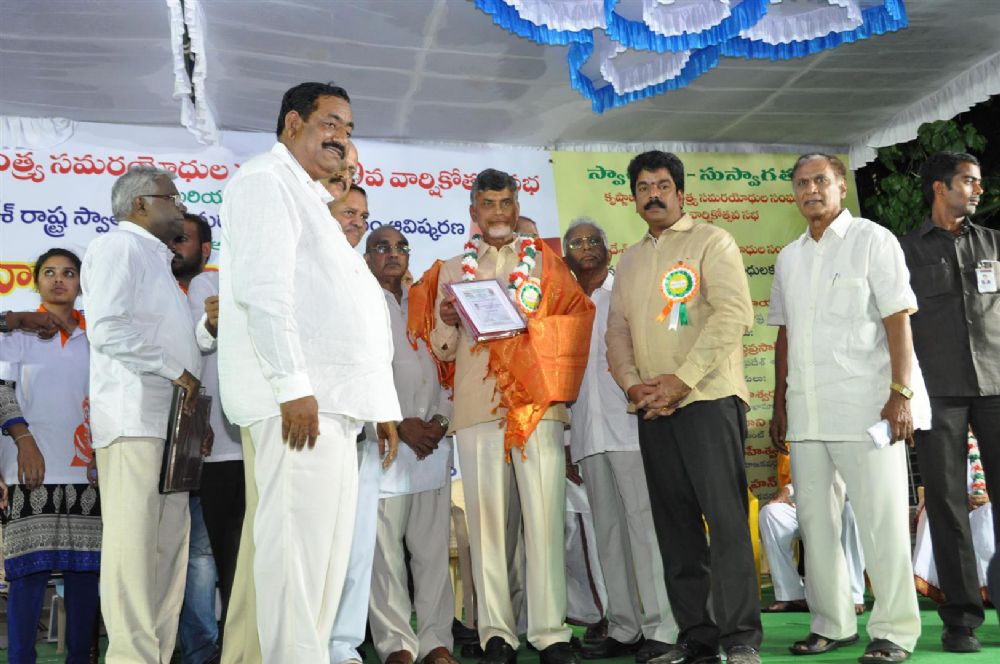 Andhra Pradesh Chief Minister N. Chandrababu Naidu felicitating Freedom Fighters from Krishna District at Vijayawada on 18th June 2016.