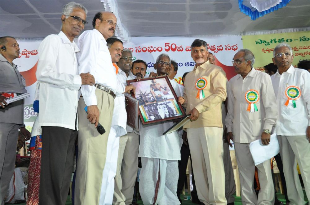 Andhra Pradesh Chief Minister N. Chandrababu Naidu felicitating Freedom Fighters from Krishna District at Vijayawada on 18th June 2016.