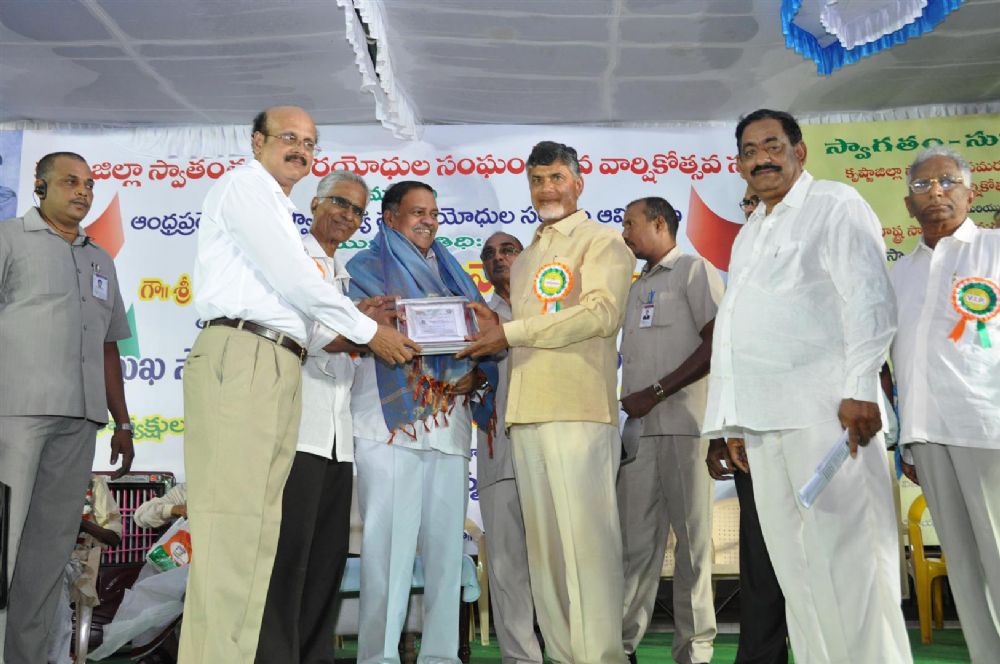 Andhra Pradesh Chief Minister N. Chandrababu Naidu felicitating Freedom Fighters from Krishna District at Vijayawada on 18th June 2016.