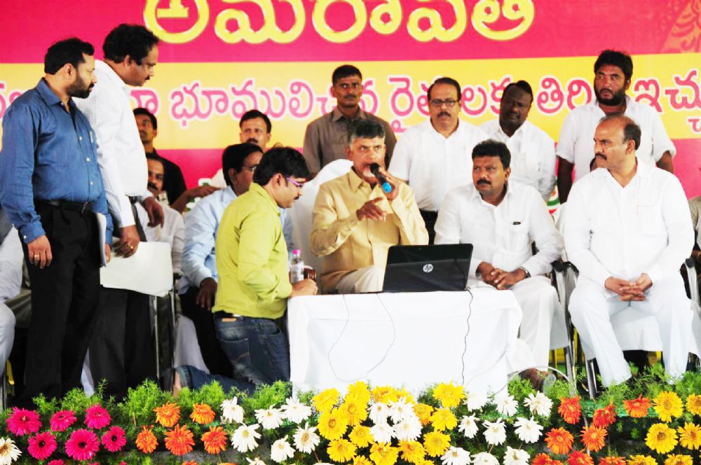 Andhra Pradesh Chief Minister N. Chandrababu Naidu distibuting plots allotment documents to the Capital Area Farmers in Amaravathi Region on 25th June 2016.