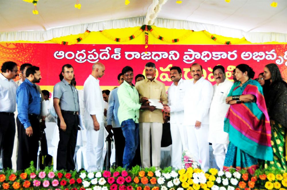 Andhra Pradesh Chief Minister N. Chandrababu Naidu distibuting plots allotment documents to the Capital Area Farmers in Amaravathi Region on 25th June 2016.
