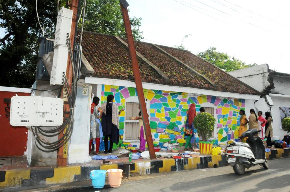Students painting the road side walls on the part of Poster Free City in Vijayawada on 28th July 2016.