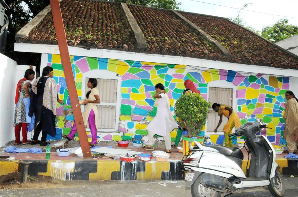 Students painting the road side walls on the part of Poster Free City in Vijayawada on 28th July 2016.