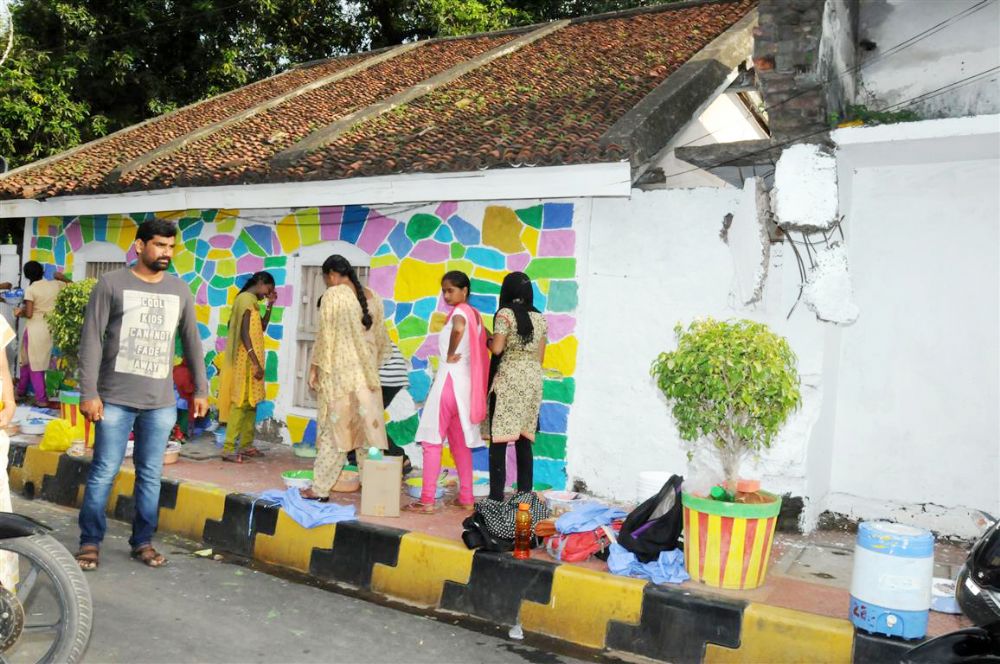 Students painting the road side walls on the part of Poster Free City in Vijayawada on 28th July 2016.