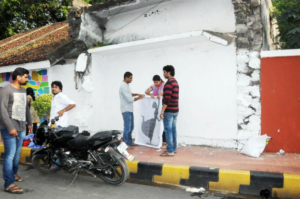 Students painting the road side walls on the part of Poster Free City in Vijayawada on 28th July 2016.