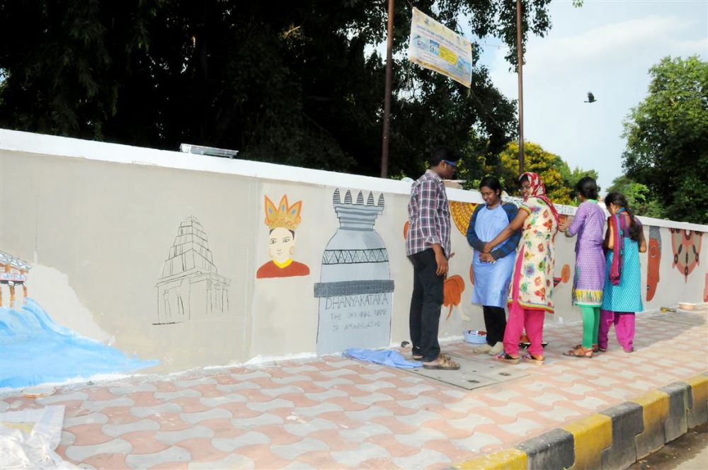 Students painting the road side walls on the part of Poster Free City in Vijayawada on 28th July 2016.