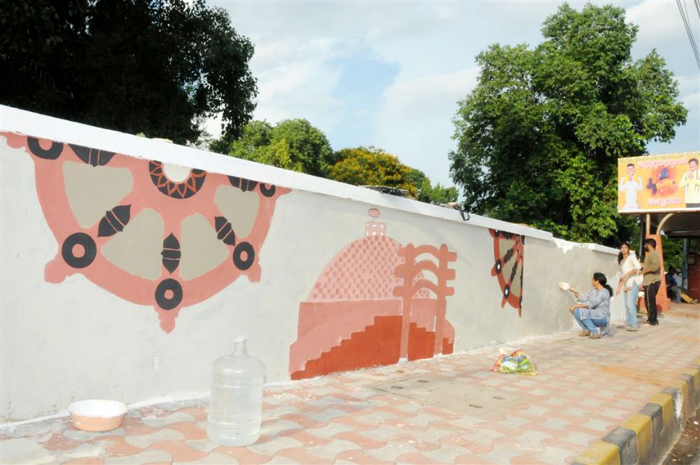 Students painting the road side walls on the part of Poster Free City in Vijayawada on 28th July 2016.