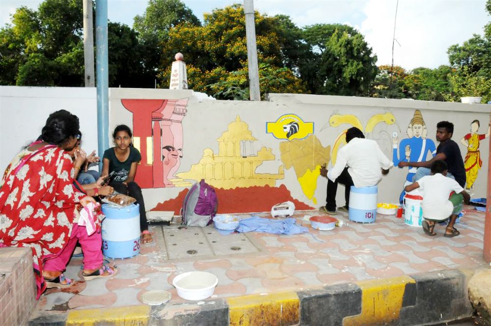 Students painting the road side walls on the part of Poster Free City in Vijayawada on 28th July 2016.
