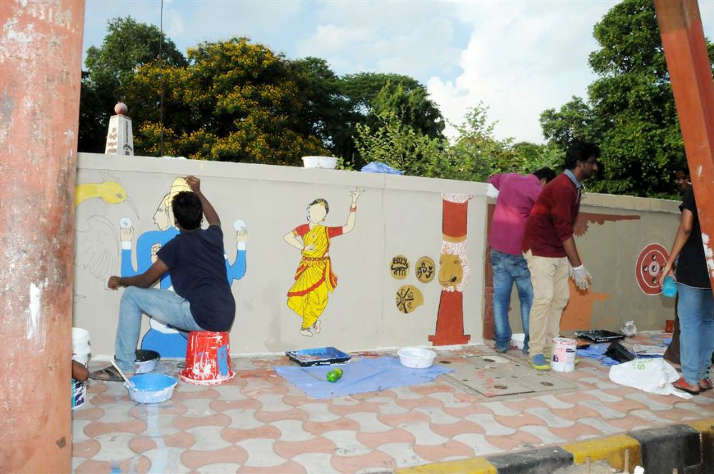 Students painting the road side walls on the part of Poster Free City in Vijayawada on 28th July 2016.