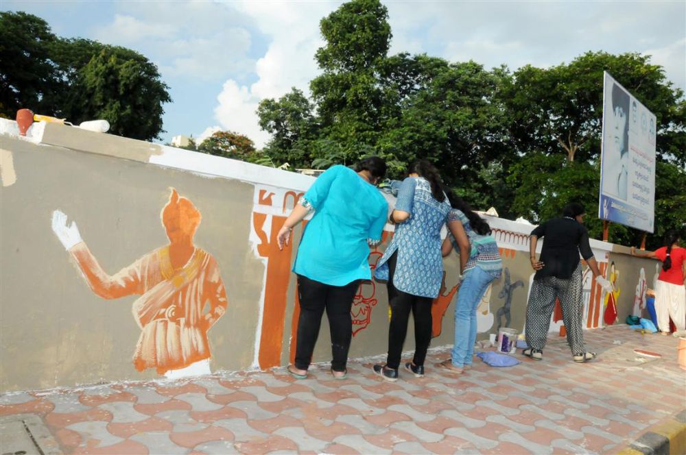 Students painting the road side walls on the part of Poster Free City in Vijayawada on 28th July 2016.