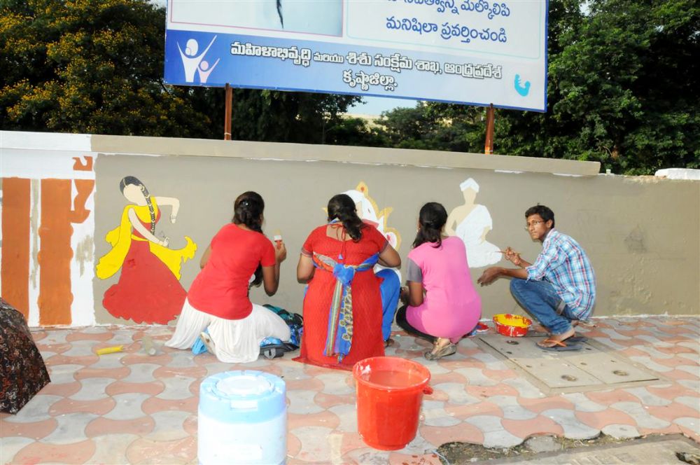 Students painting the road side walls on the part of Poster Free City in Vijayawada on 28th July 2016.