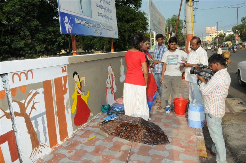 Students painting the road side walls on the part of Poster Free City in Vijayawada on 28th July 2016.
