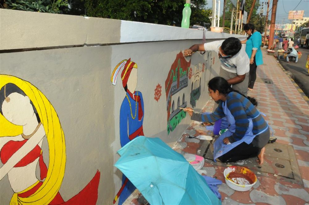 Students painting the road side walls on the part of Poster Free City in Vijayawada on 28th July 2016.
