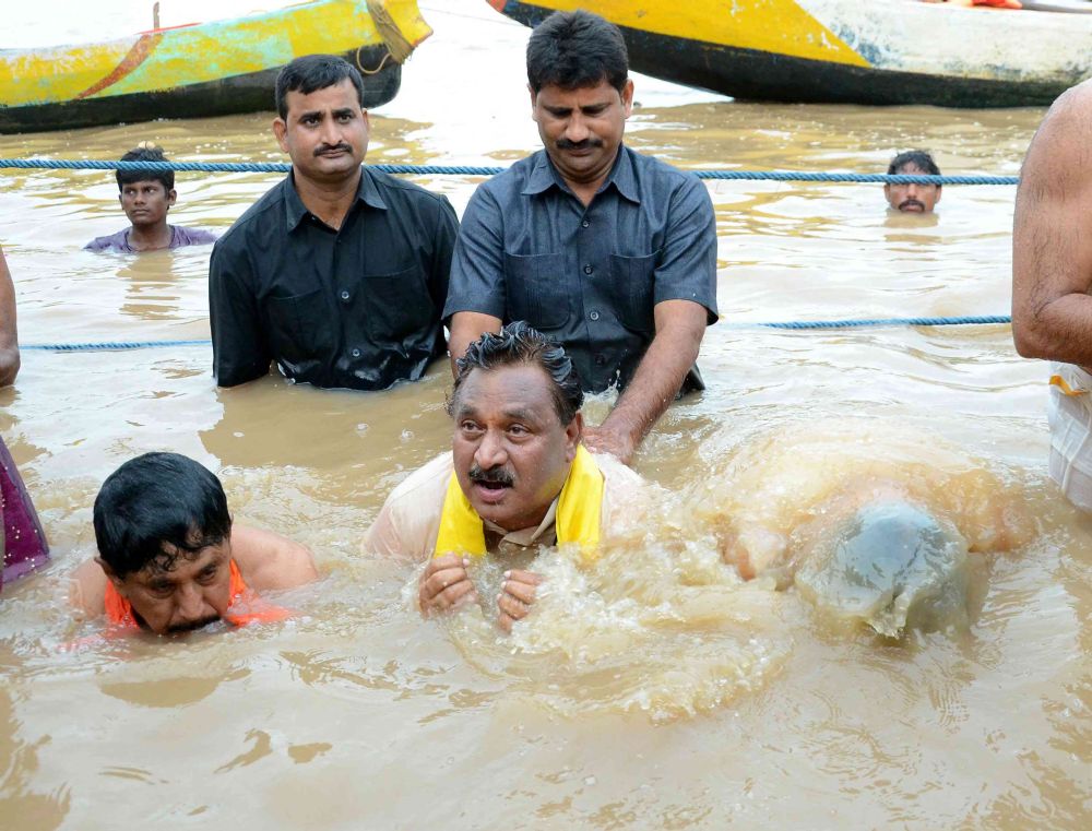 Deputy Chief Minister of Andhra Pradesh Nimmakayala Chinarajappa, MP Murali Mohan inagurated Anthya Pushkaralu at Rajahmahendravaram and taking a holy dip on River Godavari on 31th July 2016.