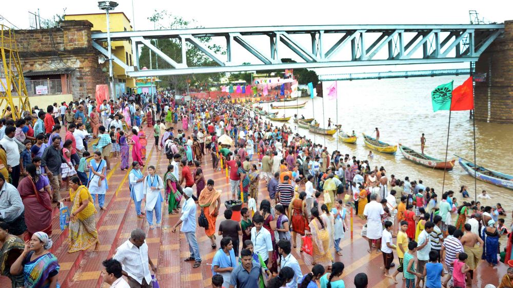 Piligrims are taking a holy dip on Day 2 of Anthya Pushkaralu of River Godavari at Rajamahendravaram on 1st August 2016.