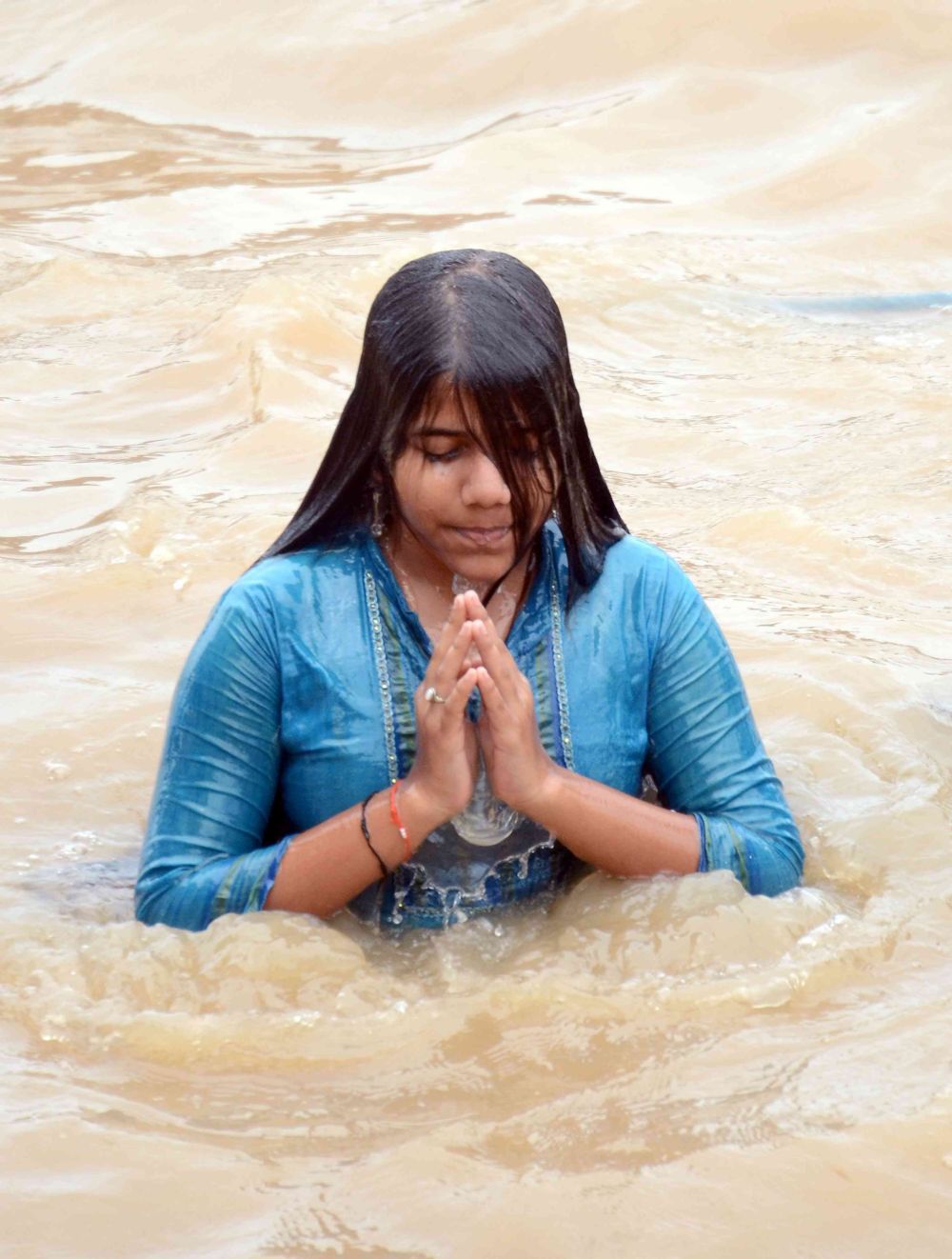 Piligrims are taking a holy dip on Day 2 of Anthya Pushkaralu of River Godavari at Rajamahendravaram on 1st August 2016.
