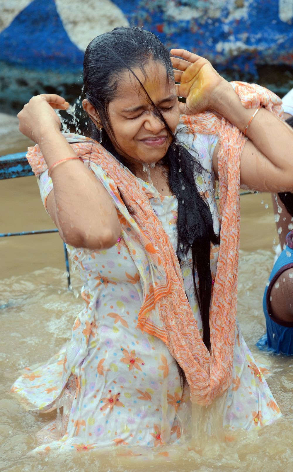 Piligrims are taking a holy dip on Day 3 of Anthya Pushkaralu of River Godavari at Rajamahendravaram on 2nd August 2016.