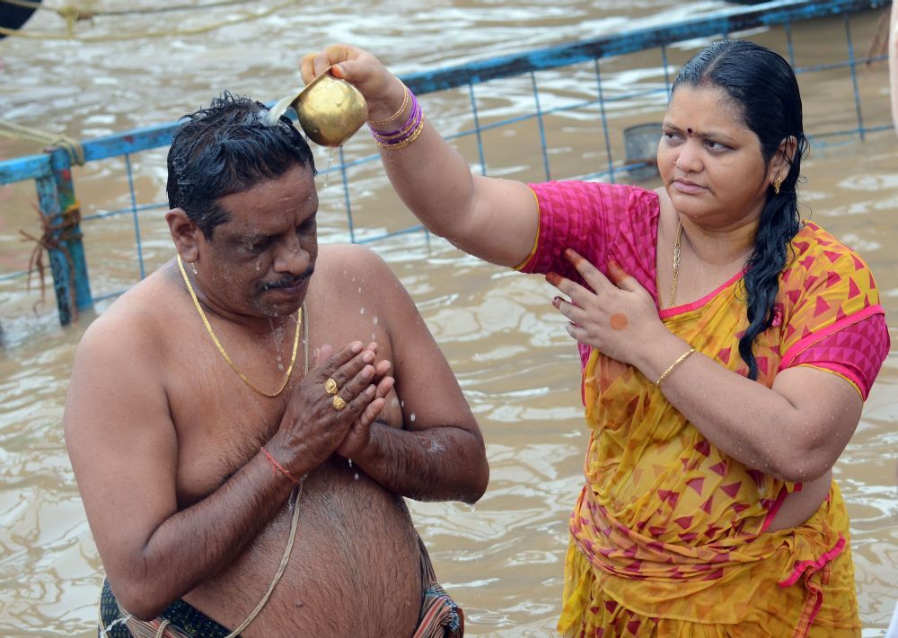 Piligrims are taking a holy dip on Day 3 of Anthya Pushkaralu of River Godavari at Rajamahendravaram on 2nd August 2016.