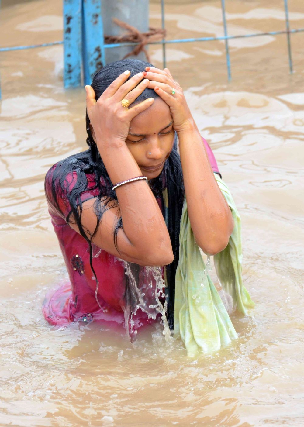 Piligrims are taking a holy dip on Day 4 of Anthya Pushkaralu of River Godavari at Rajamahendravaram on 3rd August 2016.