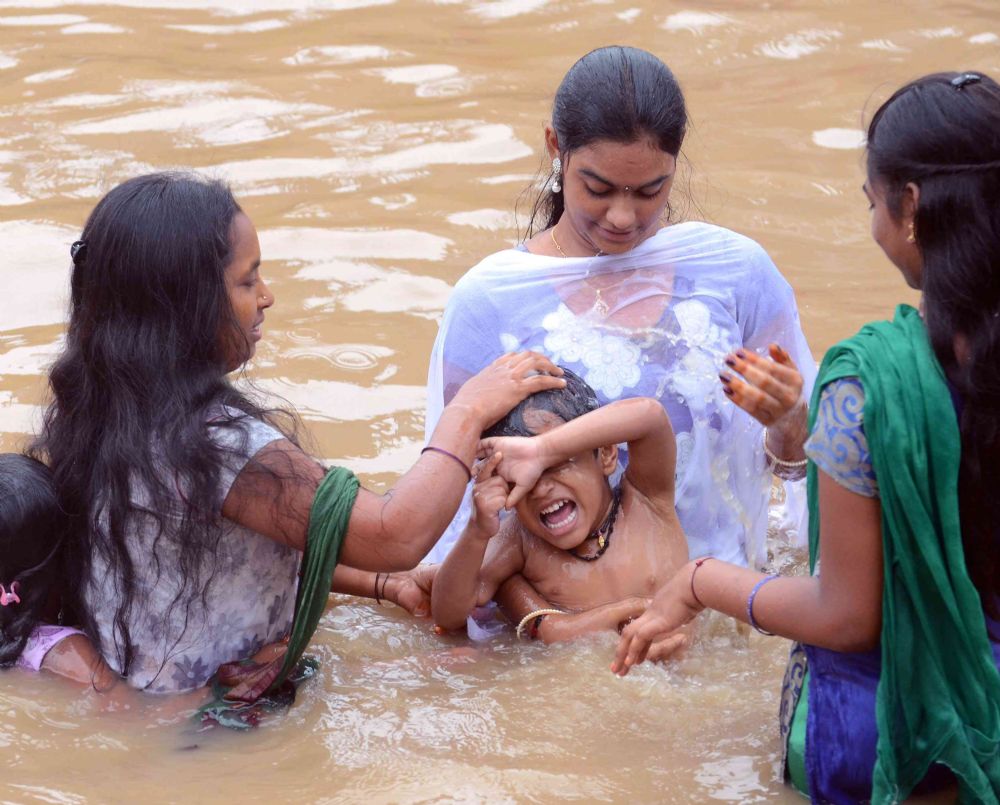 Piligrims are taking a holy dip on Day 4 of Anthya Pushkaralu of River Godavari at Rajamahendravaram on 3rd August 2016.