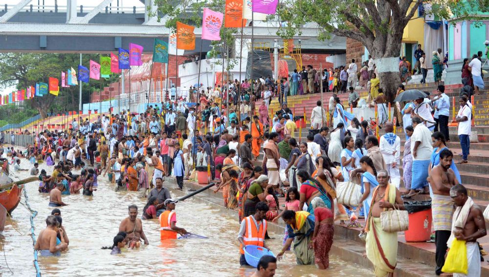 Piligrims are taking a holy dip on Day 4 of Anthya Pushkaralu of River Godavari at Rajamahendravaram on 3rd August 2016.