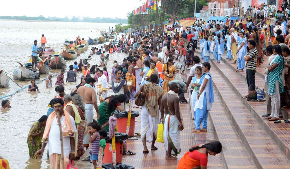 Piligrims are taking a holy dip on Day 4 of Anthya Pushkaralu of River Godavari at Rajamahendravaram on 3rd August 2016.
