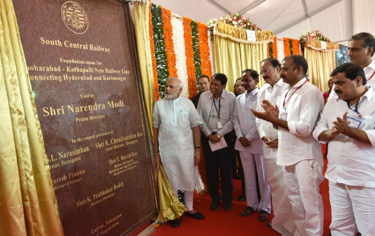 Prime Minister Narendra Modi Lays Foundation Stone for New Railway Line between Manoharabad-Kothapalli connecting Hyderabad and Karimnagar on 7th August 2016.
