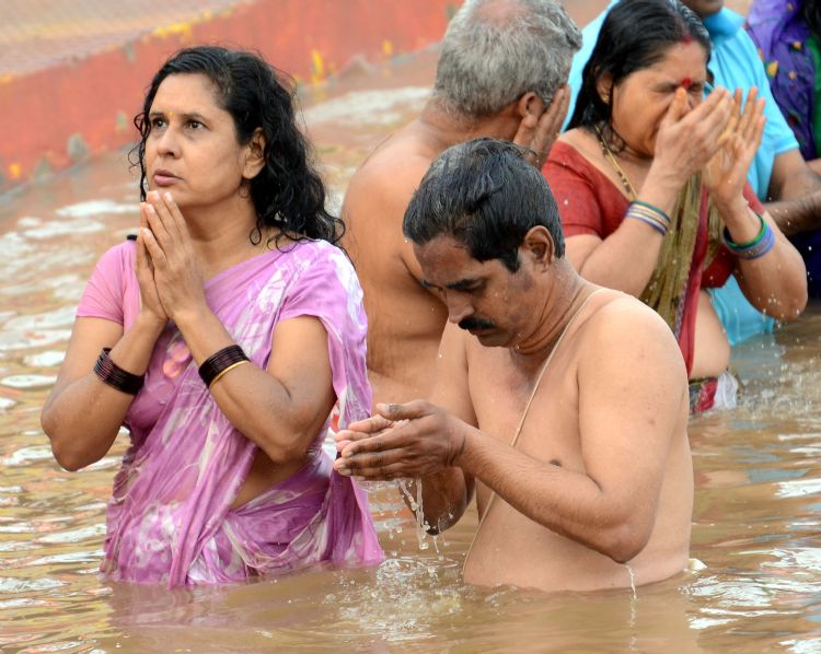 Piligrims are taking a holy dip on Last Day of Anthya Pushkaralu of River Godavari at Rajamahendravaram on 11th August 2016.