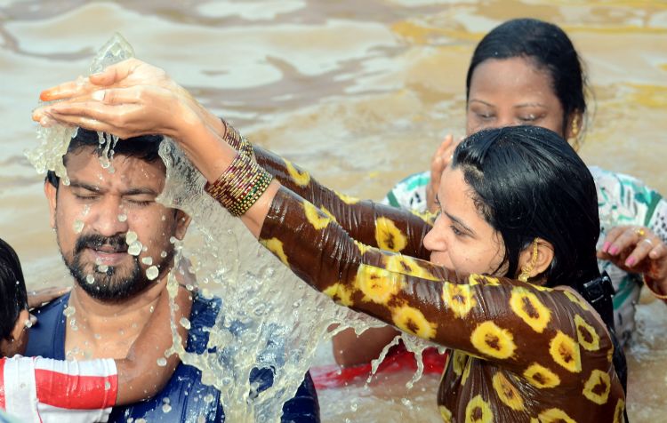 Piligrims are taking a holy dip on Last Day of Anthya Pushkaralu of River Godavari at Rajamahendravaram on 11th August 2016.