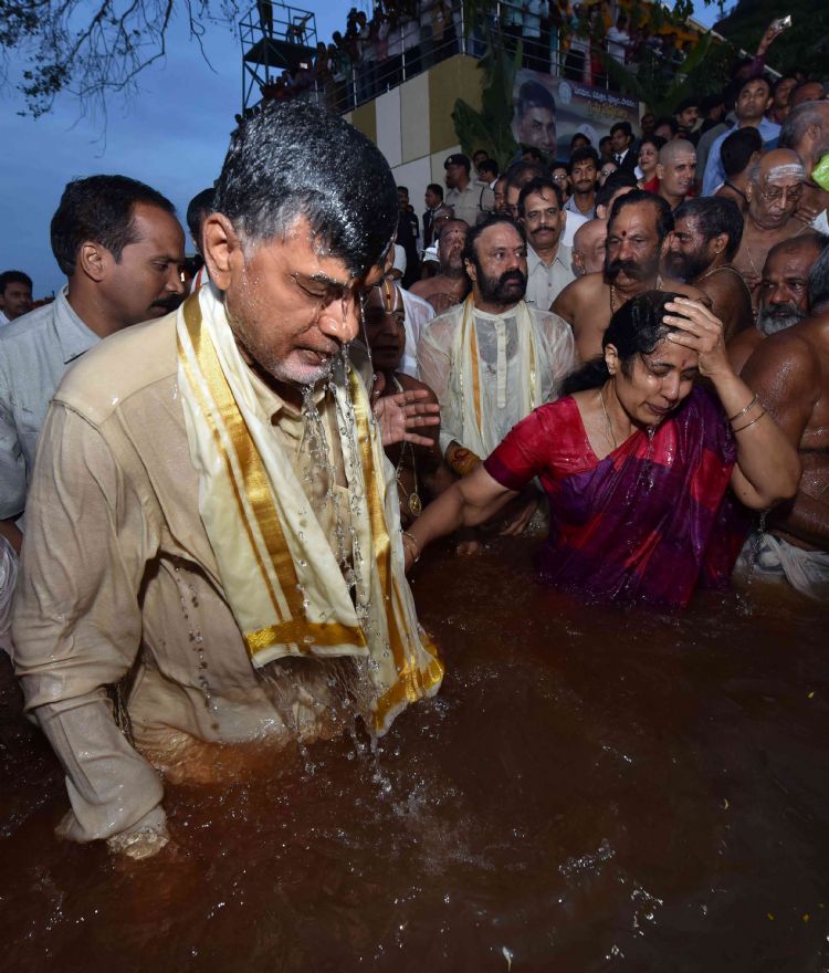 Andhra Pradesh Chief Minister N. Chandrababu Naidu taking holy dip in Krishna River on the occassion of Krishna Pushkaralu at Durga Ghat on 12th August 2016.