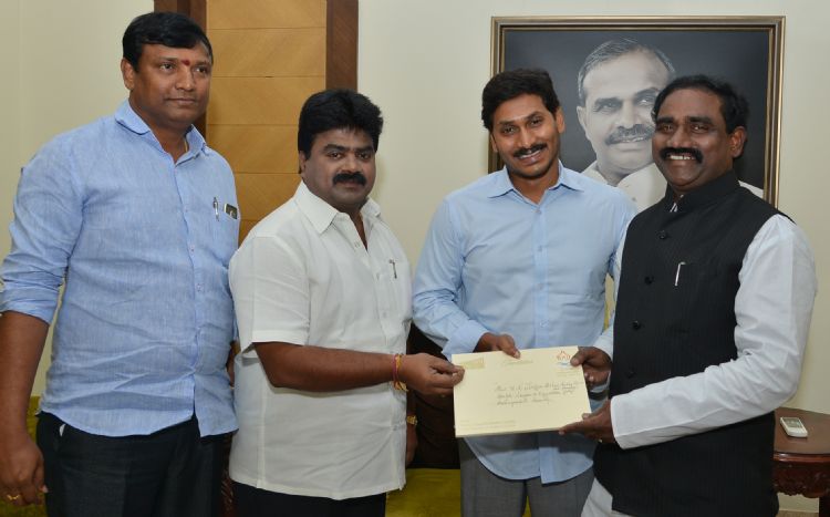Minister R. Kishor Babu and Mla Ravi kumar handing over Krishna Pushkaram invite to Leader of Opposition Jagan Mohan Reddy at the latter's residence on 13th August 2016.