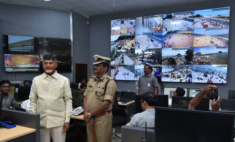 Andhra Pradesh Chief Minister N. Chandrababu Naidu and DGP Sambasiva Rao observing ghats through command control centre at Vijayawada on 13th August 2016.