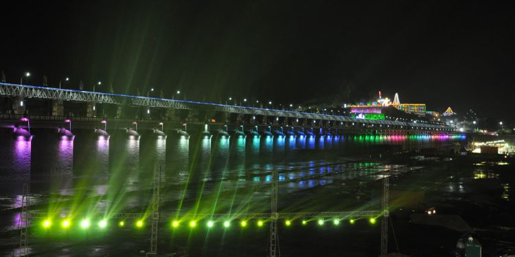 Prakasam Barrage looks stunning in the Colorful laser lighting decoration on the eve of Krishna Pushkaralu on 13th August 2016.