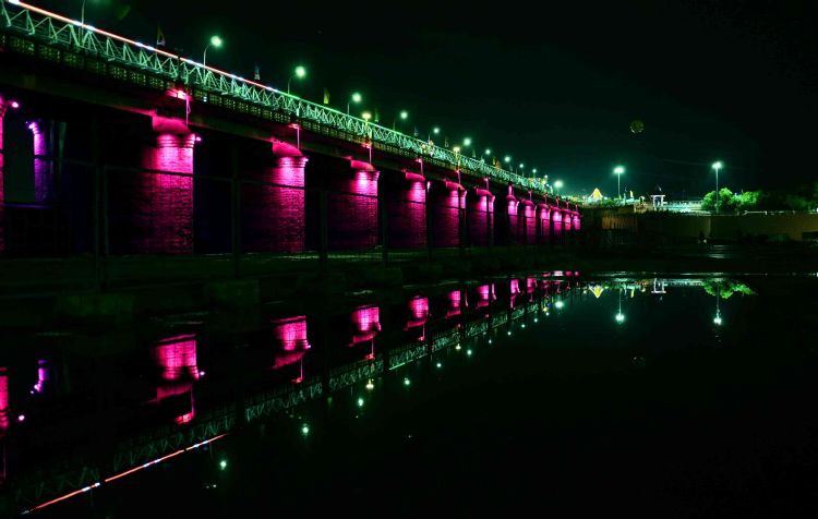 Prakasam Barrage looks stunning in the Colorful laser lighting decoration on the eve of Krishna Pushkaralu on 13th August 2016.