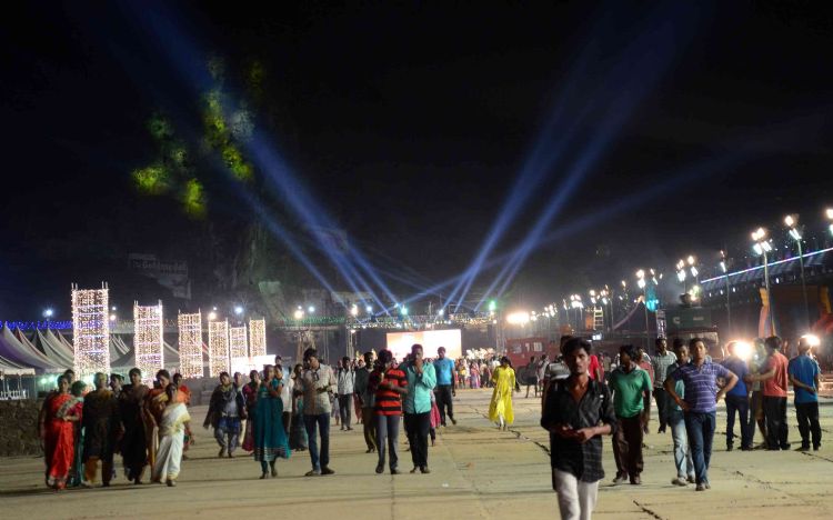 Prakasam Barrage looks stunning in the Colorful laser lighting decoration on the eve of Krishna Pushkaralu on 13th August 2016.