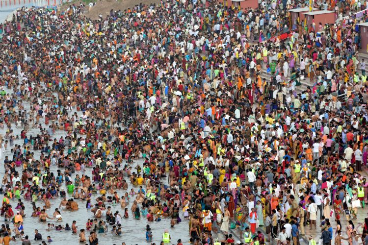 Huge Crowd of Piligrims are taking a holy dip on Day 3 of Krishna Pushkaralu at Durga Ghat near Prakasam Barrage on 14th August 2016.
