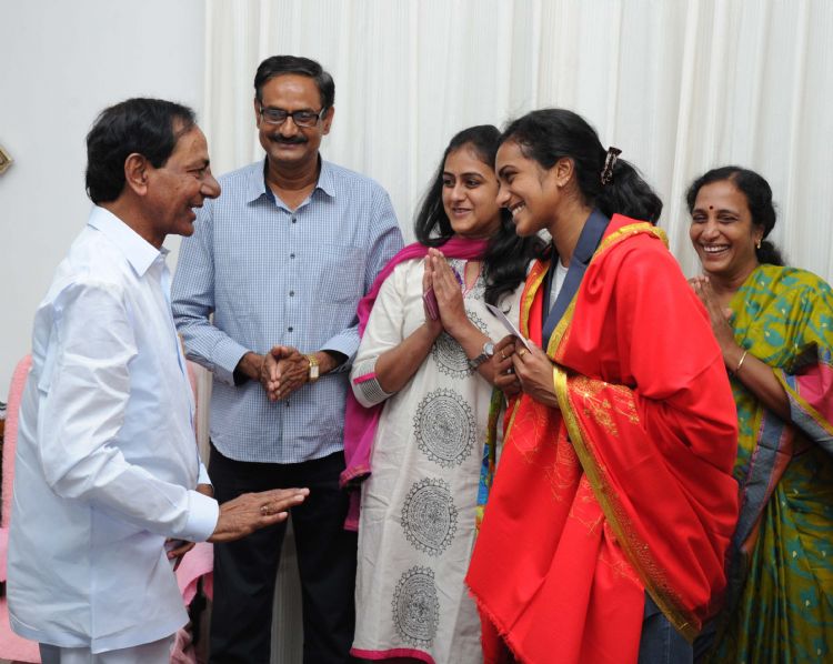 Badminton Olympic Silver Medalist PV Sindhu and Coach Pullela Gopi Chand met Chief Minister K. Chandrasekhar Rao in Hyderabad on 22nd August 2016.