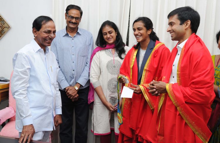 Badminton Olympic Silver Medalist PV Sindhu and Coach Pullela Gopi Chand met Chief Minister K. Chandrasekhar Rao in Hyderabad on 22nd August 2016.