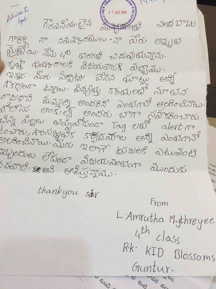 A little girl named Amrutha Mythreyee, wrote a letter to Andhra Pradesh CM Chandrababu Naidu praising the arrangements in Krishna Pushkaralu that concluded recently.
