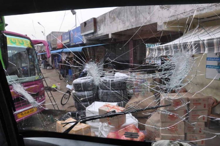 The Cauvery river water sharing dispute turned violent on Monday in Tamil Nadu and a group of protests in Rameshwaram smashed windscreens and window of buses and cars bearing Karnataka number plates.