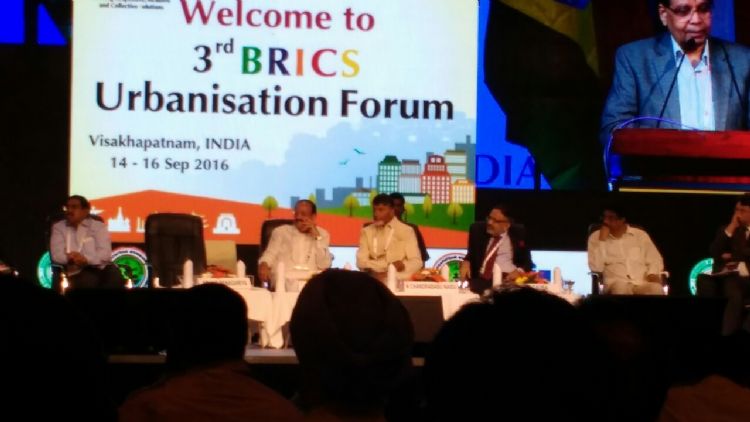 Chief Minister N Chandrababu Naidu delivering the keynote address in 3rd BRICS Urbanisation Forum inagural session at GVMC, Vishakhapatnam on 14th September 2016.