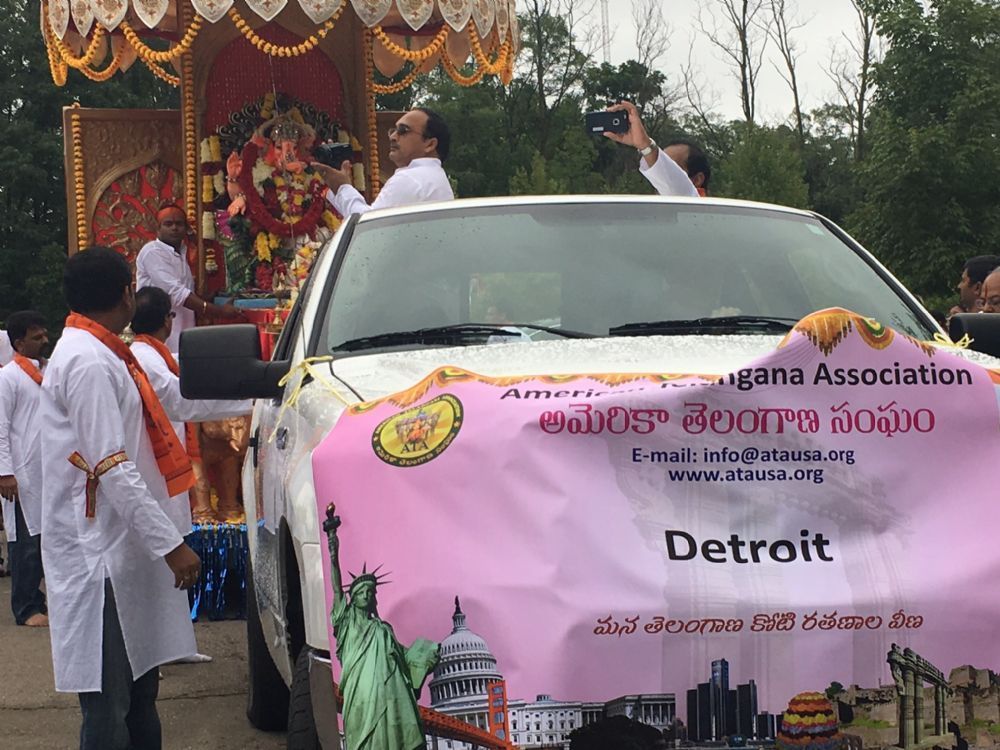 America Telangana Association held a grand procession of Lord Ganesh in Detroit after performing holy rituals for Seven days at the pandal established in Venkateswara Swamy temple premises.