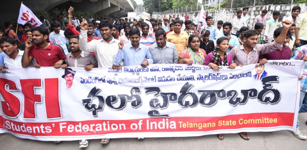 Activists of Students Federation of India organised "Chalo Secretariat" agitation on Monday demanding release of scholarship and fulfillment of other demands. The SFI activists 'gheroad' Telangana Finance Minister Eatala Rajender's car at the State Secretariat