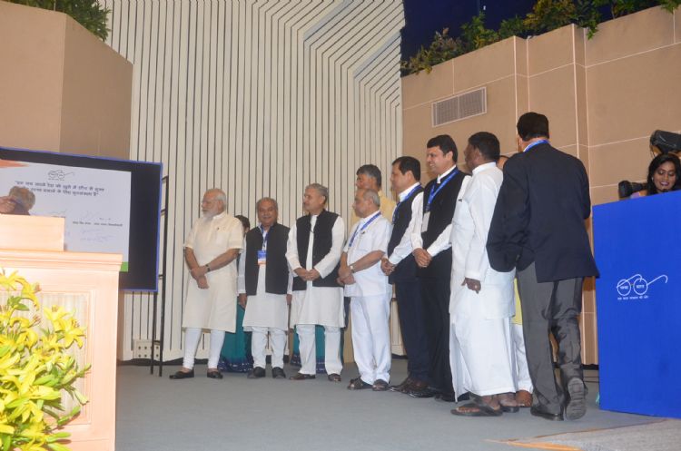 Prime Minister Narendra Modi, Union Ministers M. venkaiah Naidu, Narendra Singh Tomar, Chief Ministers and Ministers from States and Andhra Pradesh Chief Minister N. Chandrababu Naidu at a meeting of INDOSAN (India Sanitation Conference) held at Vigyan Bhavan at New Delhi on 30th September 2016.