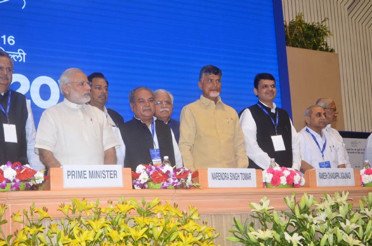 Prime Minister Narendra Modi, Union Ministers M. Venkaiah Naidu, Narendra Singh Tomar, Chief Ministers and Ministers from States and Andhra Pradesh Chief Minister N. Chandrababu Naidu at a meeting of INDOSAN (India Sanitation Conference) held at Vigyan Bhavan at New Delhi on 30th September 2016.