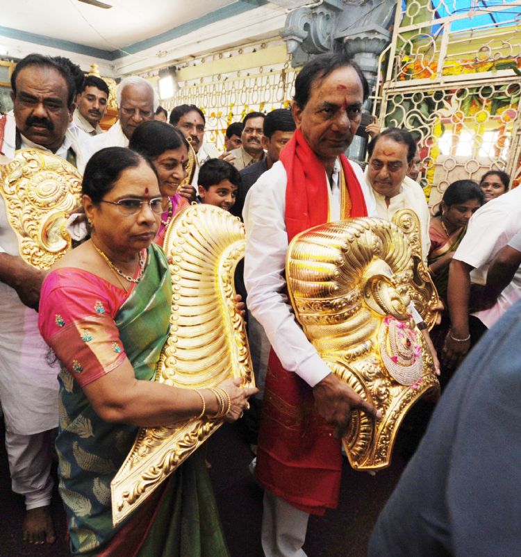 Telangana Chief Minister K. Chandrasekhar Rao and his wife gifted 3kg golden crown to famous Bhadrakali Ammavaru in Warangal on 9th October 2016.