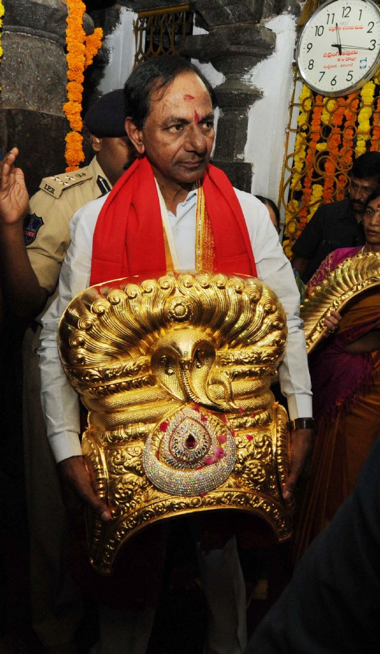 Telangana Chief Minister K. Chandrasekhar Rao and his wife gifted 3kg golden crown to famous Bhadrakali Ammavaru in Warangal on 9th October 2016.