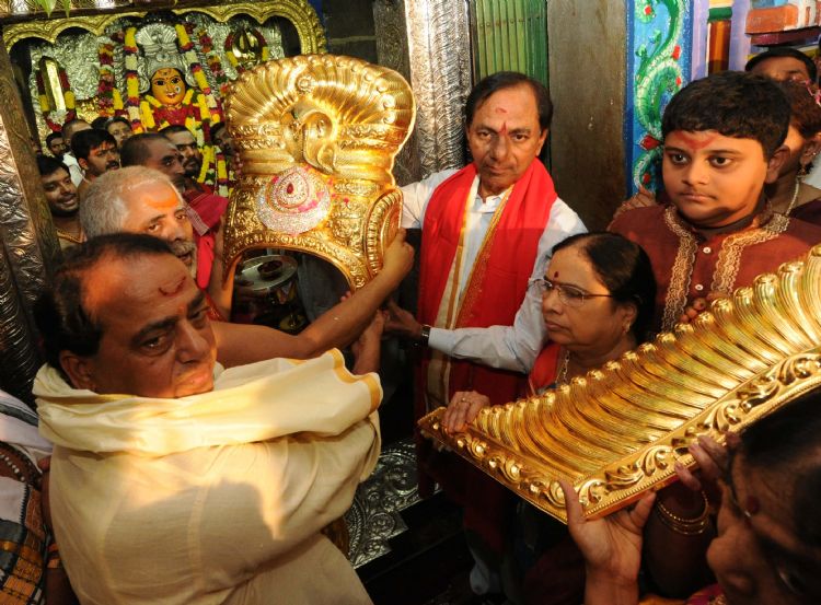 Telangana Chief Minister K. Chandrasekhar Rao and his wife gifted 3kg golden crown to famous Bhadrakali Ammavaru in Warangal on 9th October 2016.