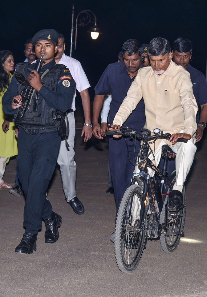 Andhra Pradesh Chief Minister N. Chandrababu Naidu took a late night bicycle ride on Saturday to test the electrical bicycle designed and created by cycle enthusiast G. Raja.
