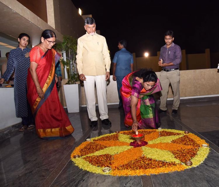Andhra Pradesh Chief Minister Chandrababu Naidu celebrated Diwali with family members at Camp Office in Vijayawada.